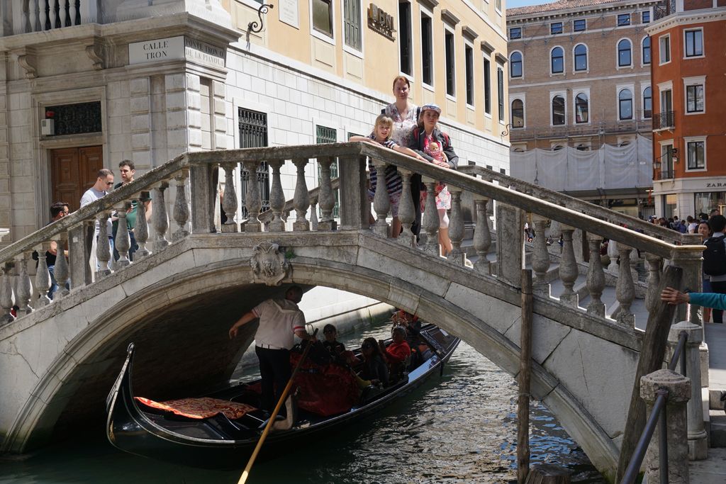 Na další cestu jsem si raději zapnul navigaci. Proplétali jsme se úzkými uličkami, přecházeli přes mosty nad kanály, až jsme potkali čekajícího gondoliéra. Nastal čas splnit dětské přání. Smlouvat moc nechtěl, takže jsme odsouhlasili částku 80 € za půl hodiny a nalodili se. Dospělí si sedli dozadu na lavici, děti na židle před nimi. A za našimi zády stál gondoliér s obřím bidlem. Jak se úzká a deset metrů dlouhá loď během nasedání rozkymácela, Verunka se polekala a sedla si mezi nás. Prostě romantika s dětmi.